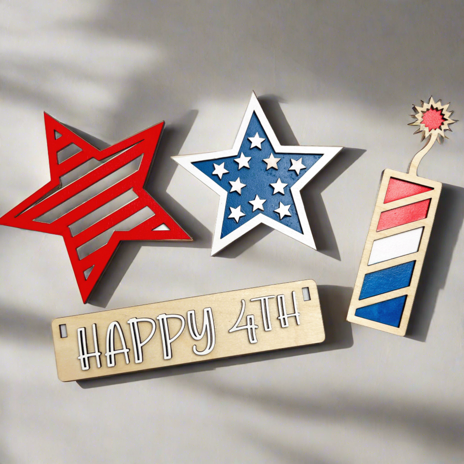 Show your patriotism with this stylish 4th of July shelf crate insert. The home décor piece features a colorful firework design, perfect for any 4th of July celebration. Celebrate in style with this fun, festive décor! Please note, this listing is for the insert shapes/sign only. Add the Decorative Shelf Crate for the complete package!