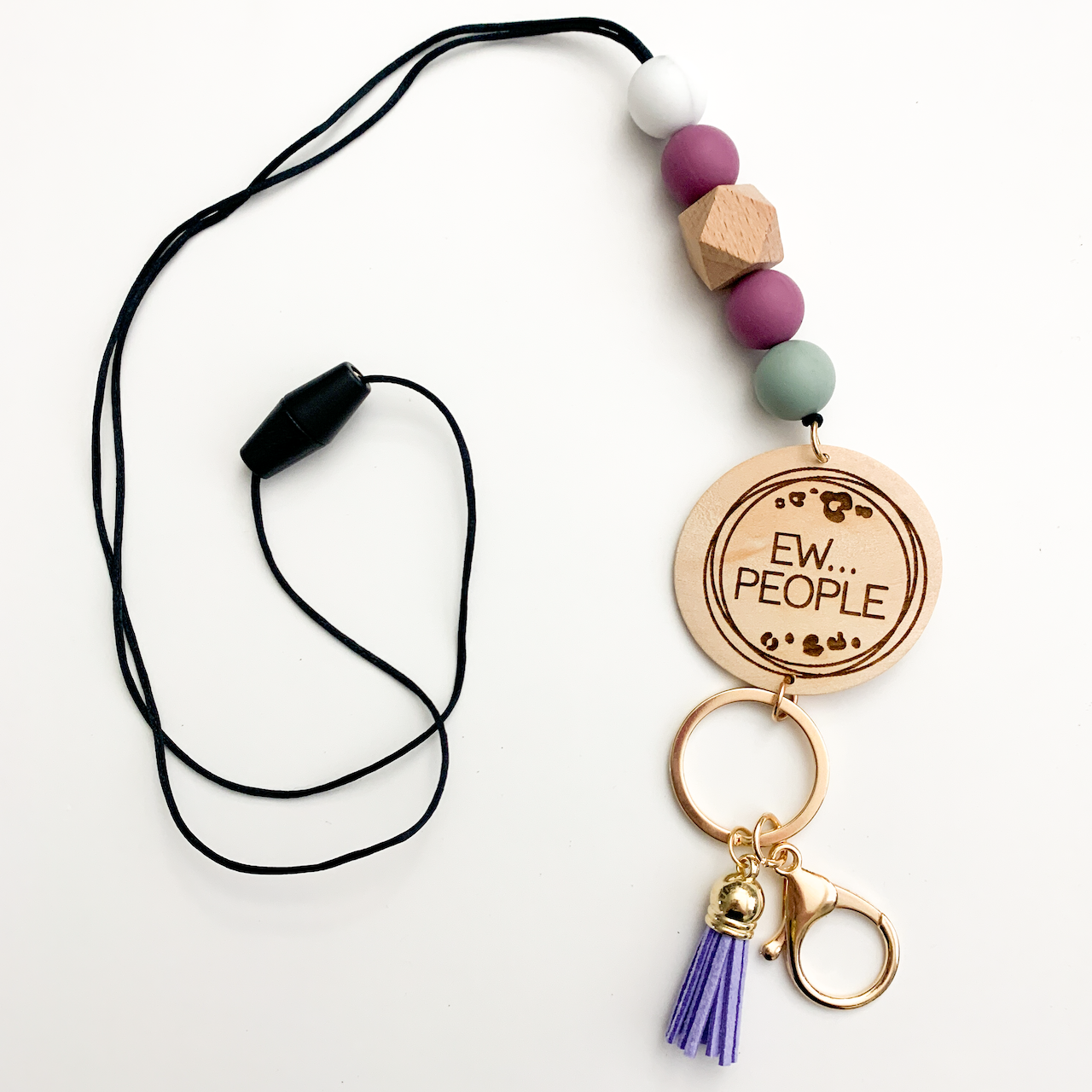 Don't we all have those days where we just want to say ew, people? Our Ew People Lanyard is the perfect way to tell someone maybe you just need some space for the day! Our lanyards are offered in a variety of colors and we can add your name to the other side of the wooden disk to customize the item for you!