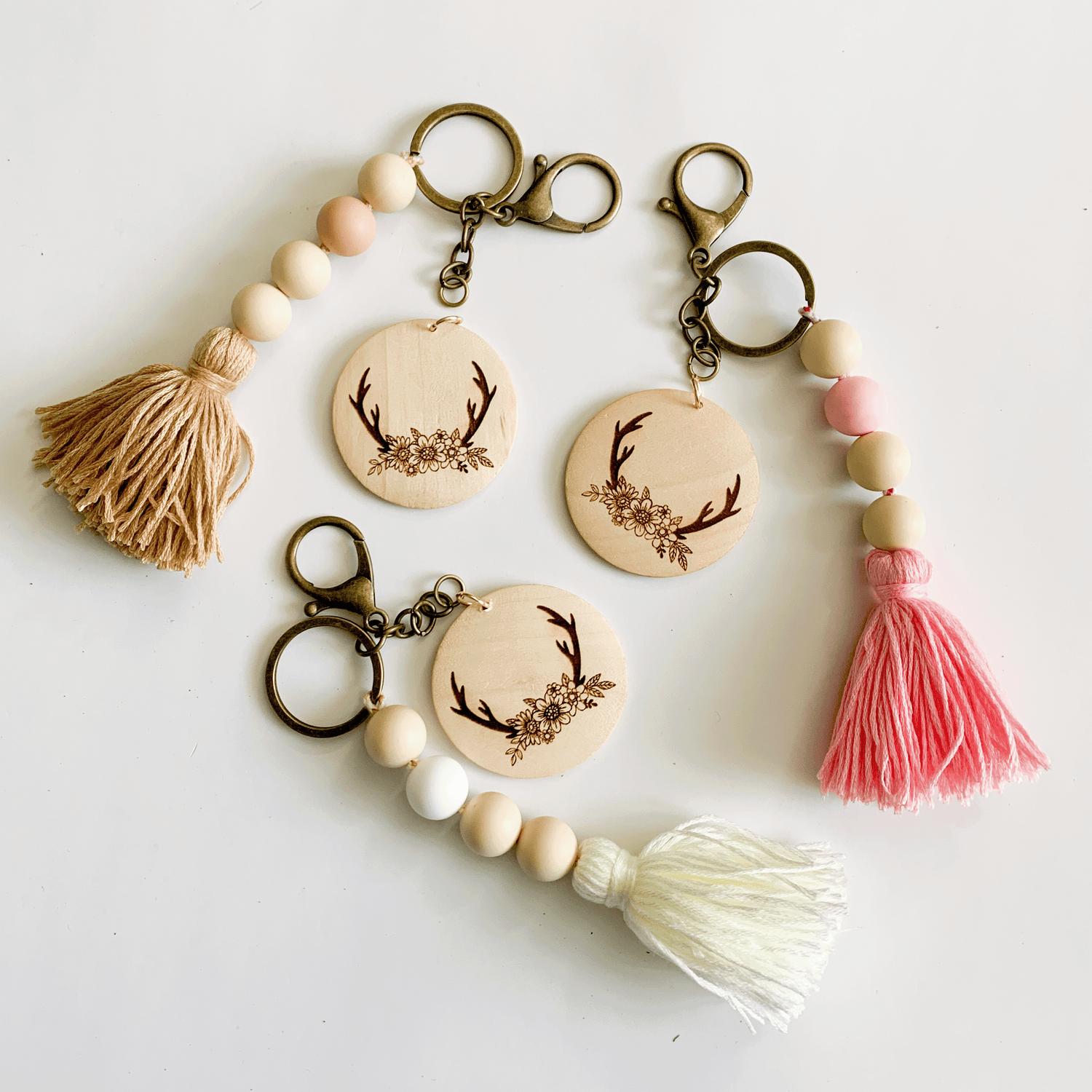Who knew antlers could look so beautiful! Our Floral Antler Tassel Keychain is the perfect way to show off something unique! Our keychains are offered in a variety of colors and we can add your name to the other side of the wooden disk to customize the item for you!